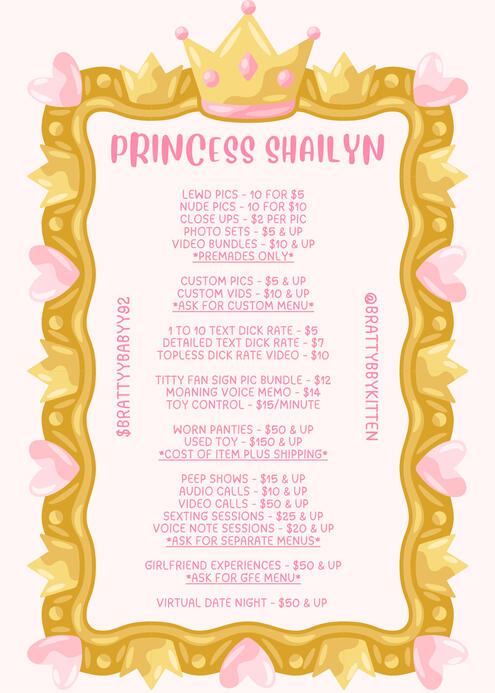You can call me Princess or Shailyn. Iām 33 years old and my pronouns are she/her. Iām a little and a sub with a bratty attitude. Iām a kitty/bunny girl. My favorite color is pink and I love Sanrio. I enjoy being treated like a princess and I will not accept anything less! With that being said, if you would like to spoil me or buy my content, reach out to me on one of my sites š