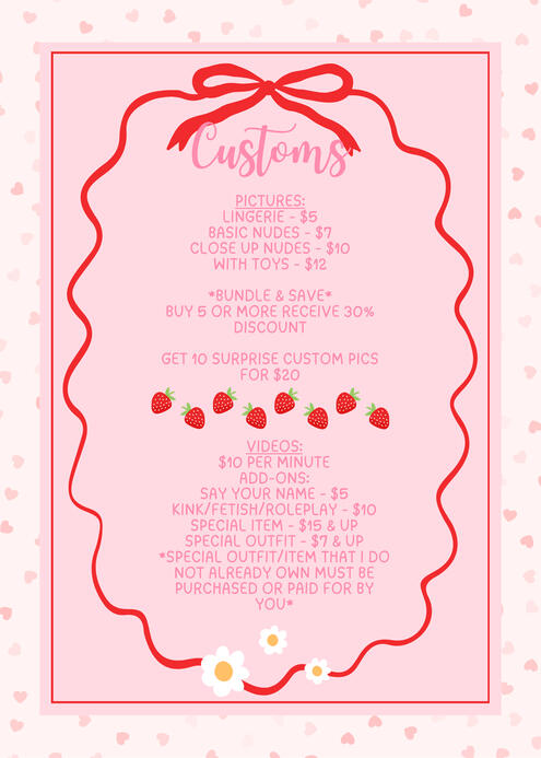 Please use the custom request form on my YourVids for any video, audio, or picture customs you may be interested in. This is my preferred method to receive custom requests but I will consider requests elsewhere if you are respectful and follow proper age verification procedures.